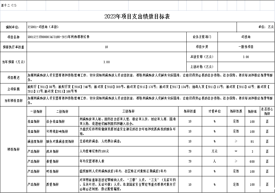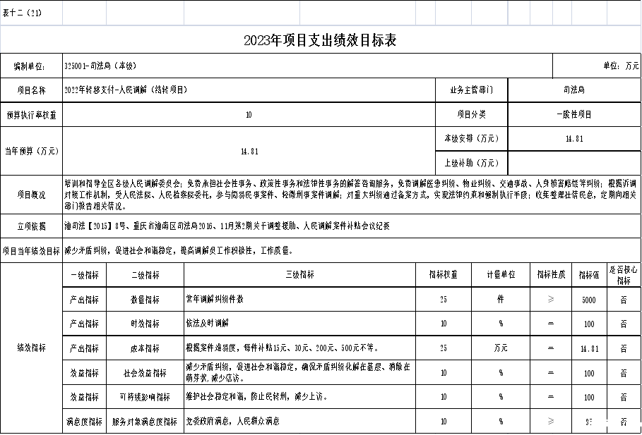 2023年一般公共预算财政拨款收入3008.23万元,一般公共预算财政拨款支出3008.23万元,比2022年增加31.14万元。其中:基本支出1947.58万元,比2022年增加232.63万元,主要原因是2023年滚动调资及公积金预算标准变化所致,基本支出主要用于保障在职人员工资福利及社会保险缴费,离退休人员医疗费及健康休养费,保障部门正常运转的各项商品服务支出;项目支出1060.65万元,比2022年减少201.49万元,主要原因是提前安排政法转移支付减少44万元、2022年财政收回后重新安排专项减少154.49万元以及区级专项减少3万元。项目支出主要用于依法治区、法律援助、人民调解、社区矫正、刑满释放人员安置帮教、普法宣传、律师管理等专项业务(办案)支出及装备支出。