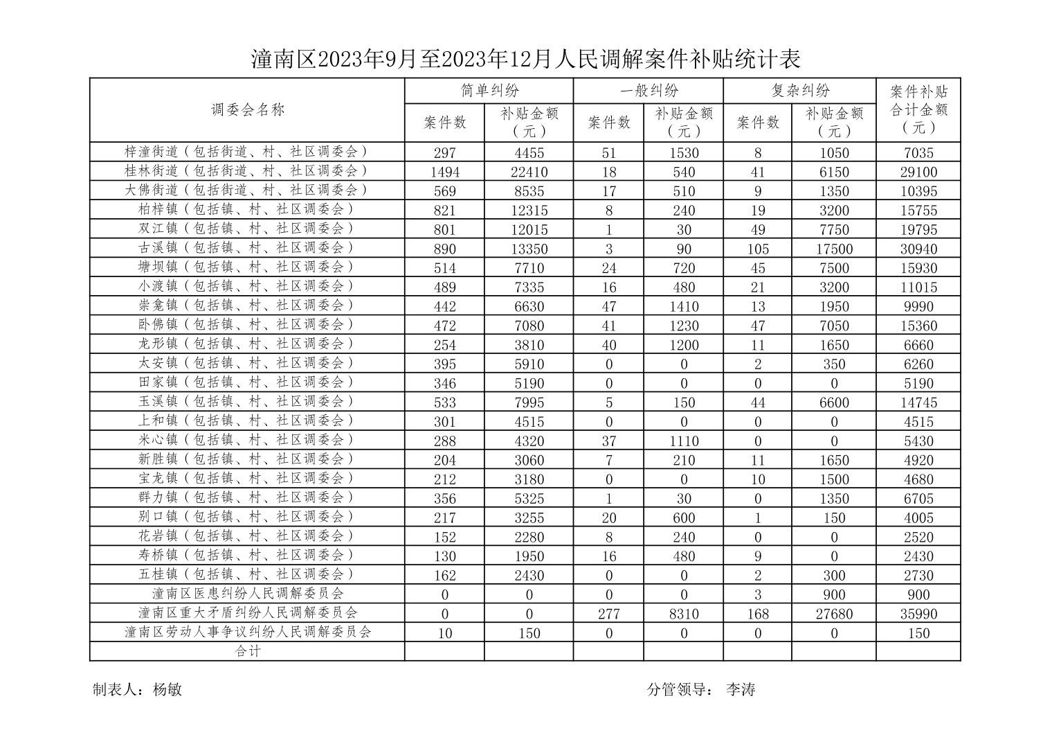 潼南区2023年9月至2023年12月人民调解案件补贴统计表